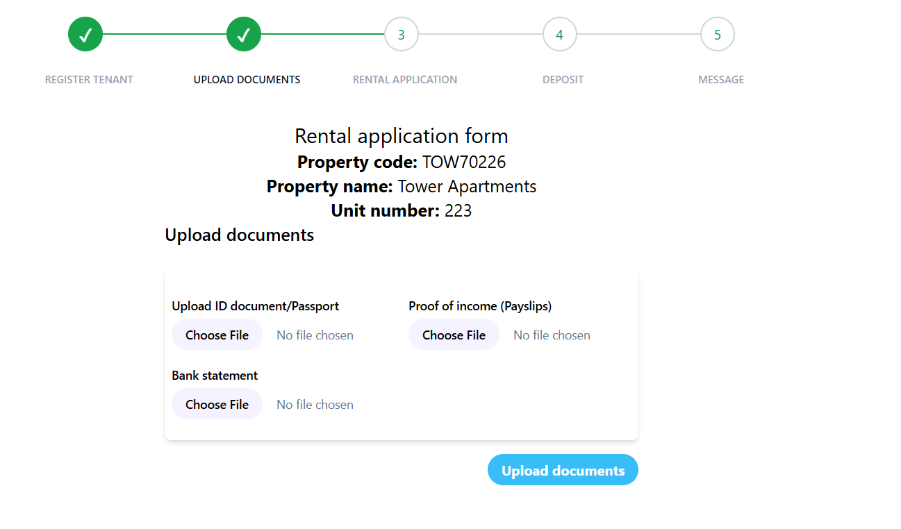 Tenants can easily upload required documents like identification, proof of income, and references as part of their application